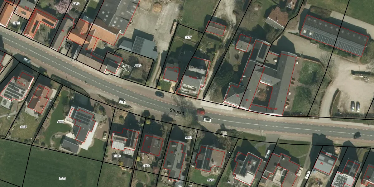Het perceel waarop Strucht 52-B staat heeft een oppervlakte van 2308 m². Dit is een zeer groot perceel. De perceeloppervlakte wordt geregistreerd door het Kadaster. Gedetailleerde informatie over de maten van dit perceel kunt u vinden in het rapport Kadastrale kaart met maatvoering van Strucht 52-B.