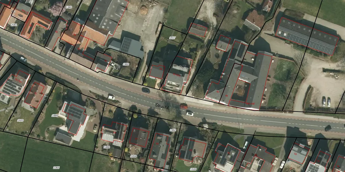 Het perceel waarop Strucht 52-F staat heeft een oppervlakte van 2308 m². Dit is een zeer groot perceel. De perceeloppervlakte wordt geregistreerd door het Kadaster. Gedetailleerde informatie over de maten van dit perceel kunt u vinden in het rapport Kadastrale kaart met maatvoering van Strucht 52-F.