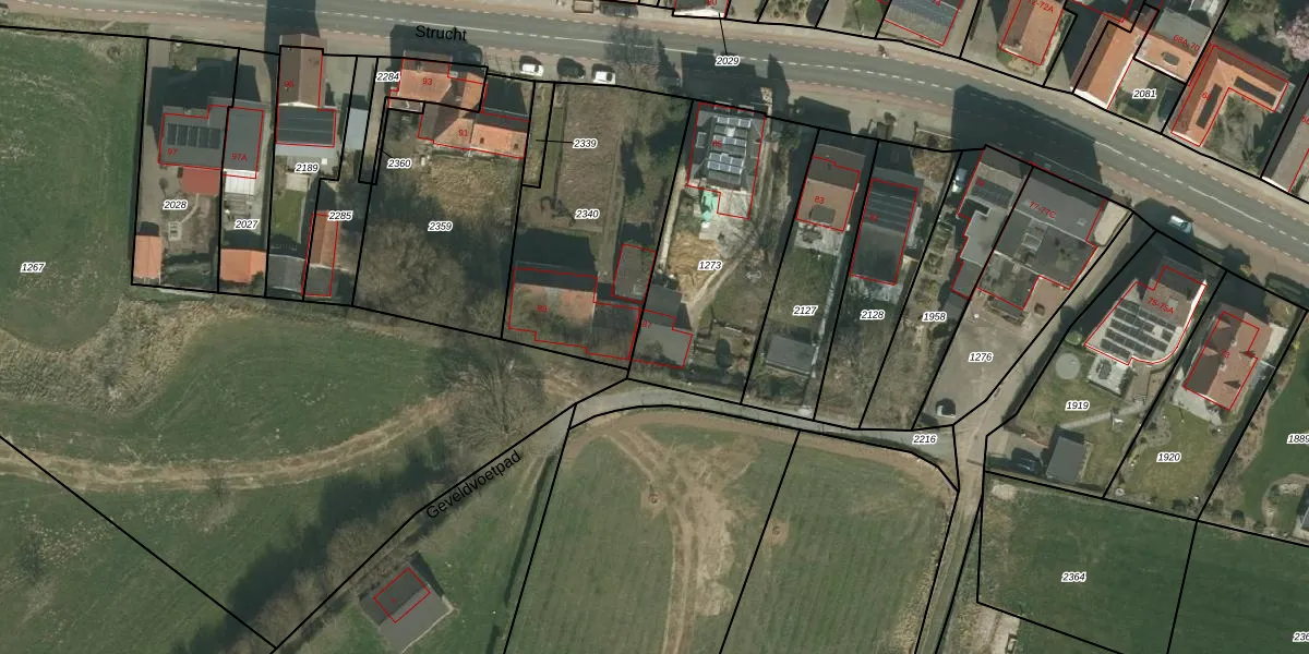 Strucht 87 is gelegen op kadastraal perceel SCH02C1273. Deze kadastrale aanduiding is uniek en wordt gebruikt door het Kadaster om eigendomsrechten en andere zakelijke rechten vast te leggen. Het perceel maakt onderdeel uit van de kadastrale gemeente Schin op Geul.