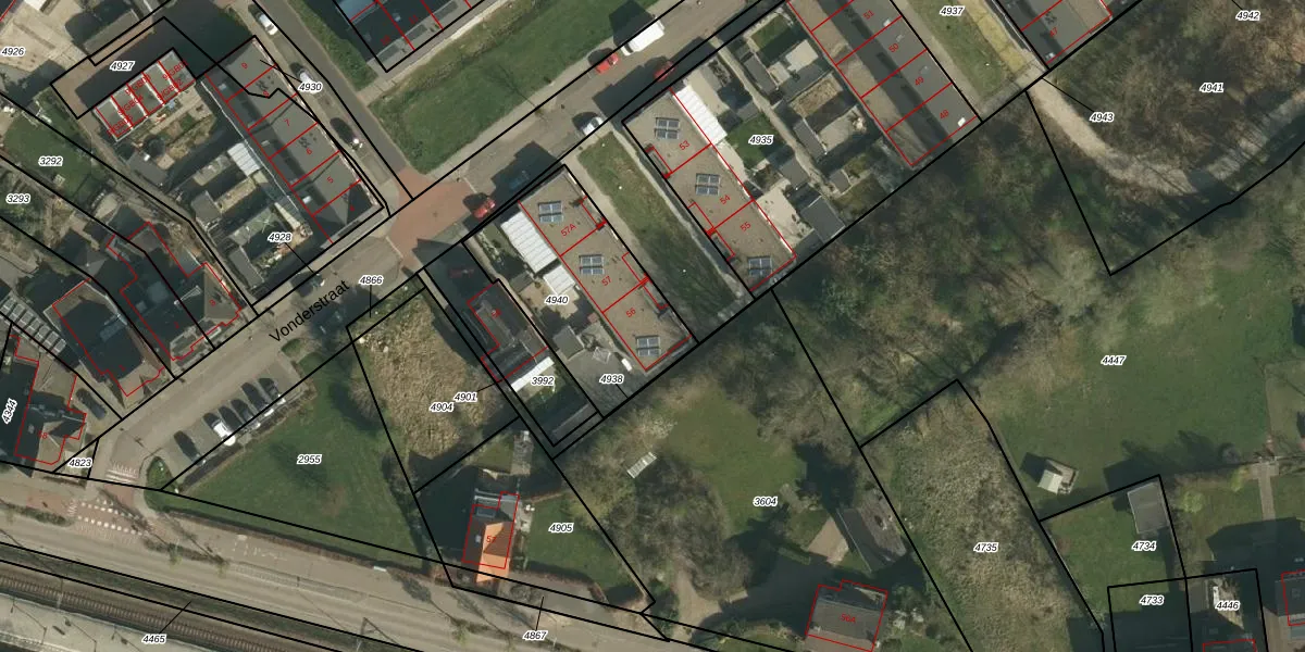 Vonderstraat 56 is gelegen op kadastraal perceel SNN00D4940. Deze kadastrale aanduiding is uniek en wordt gebruikt door het Kadaster om eigendomsrechten en andere zakelijke rechten vast te leggen. Het perceel maakt onderdeel uit van de kadastrale gemeente Schinnen.