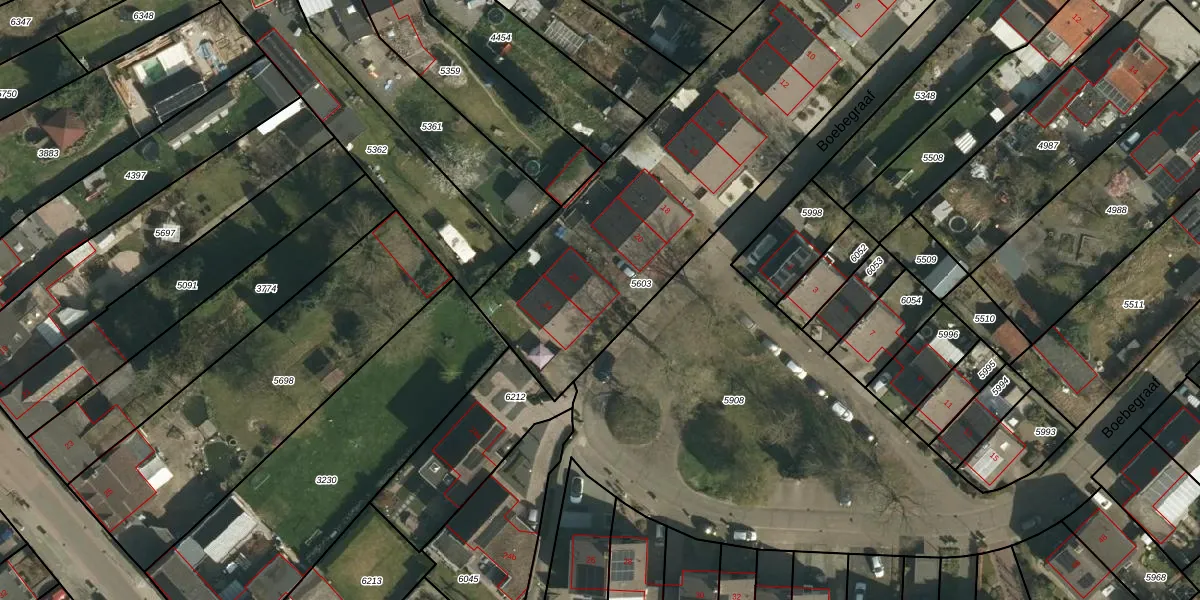 Het perceel waarop Boebegraaf 22 staat heeft een oppervlakte van 2388 m². Dit is een zeer groot perceel. De perceeloppervlakte wordt geregistreerd door het Kadaster. Gedetailleerde informatie over de maten van dit perceel kunt u vinden in het rapport Kadastrale kaart met maatvoering van Boebegraaf 22.