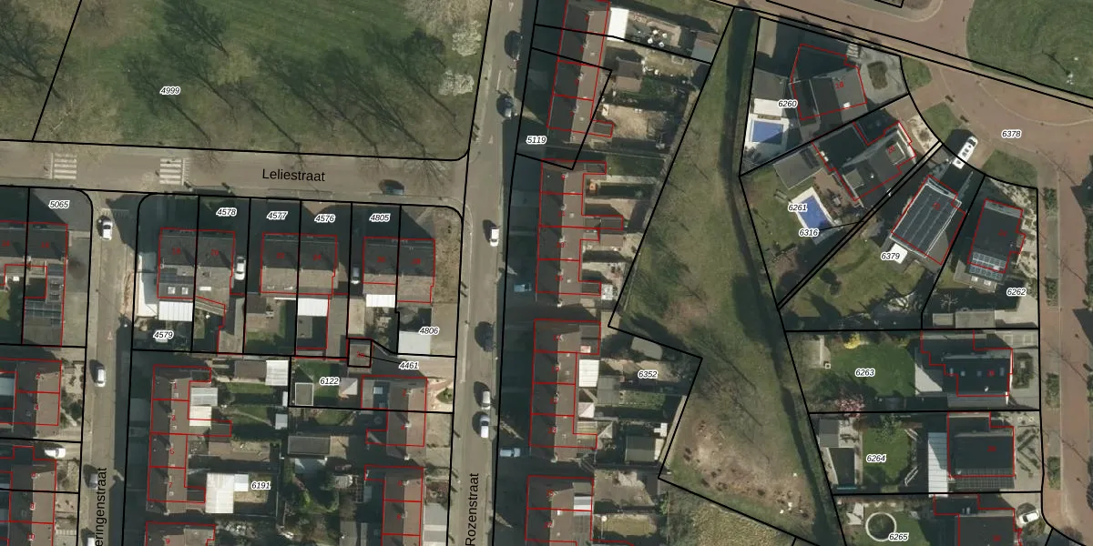 Het perceel waarop Rozenstraat 15 staat heeft een oppervlakte van 3595 m². Dit is een zeer groot perceel. De perceeloppervlakte wordt geregistreerd door het Kadaster. Gedetailleerde informatie over de maten van dit perceel kunt u vinden in het rapport Kadastrale kaart met maatvoering van Rozenstraat 15.