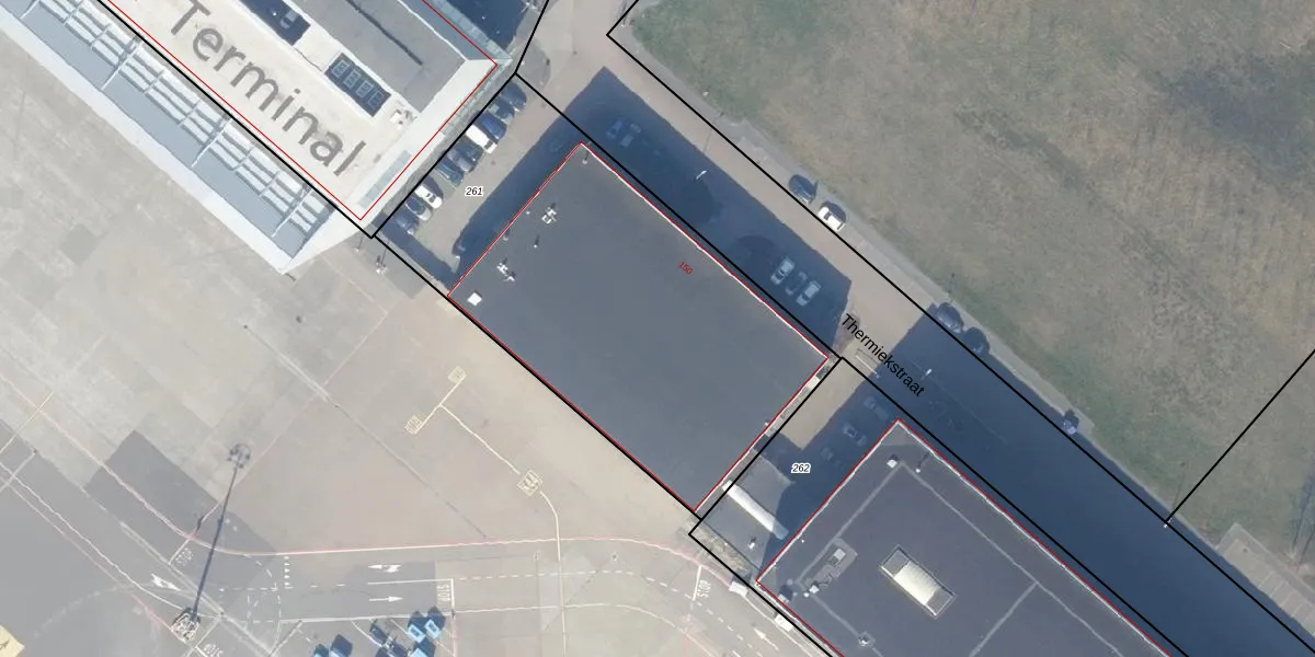 Het perceel waarop Thermiekstraat 150 staat heeft een oppervlakte van 2096 m². Dit is een zeer groot perceel. De perceeloppervlakte wordt geregistreerd door het Kadaster. Gedetailleerde informatie over de maten van dit perceel kunt u vinden in het rapport Kadastrale kaart met maatvoering van Thermiekstraat 150.