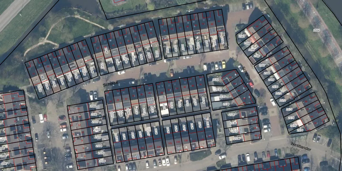 Het perceel waarop Schouw 32 staat heeft een oppervlakte van 95 m². Dit is een klein perceel. De perceeloppervlakte wordt geregistreerd door het Kadaster. Gedetailleerde informatie over de maten van dit perceel kunt u vinden in het rapport Kadastrale kaart met maatvoering van Schouw 32.