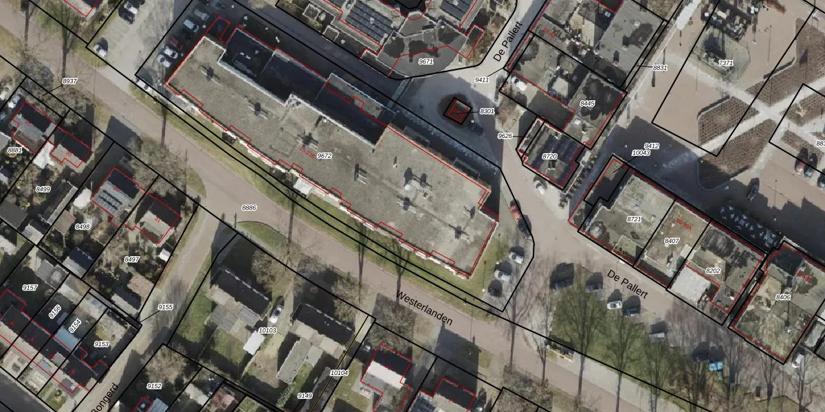 Het perceel waarop De Pallert 103 staat heeft een oppervlakte van 3059 m². Dit is een zeer groot perceel. De perceeloppervlakte wordt geregistreerd door het Kadaster. Gedetailleerde informatie over de maten van dit perceel kunt u vinden in het rapport Kadastrale kaart met maatvoering van De Pallert 103.