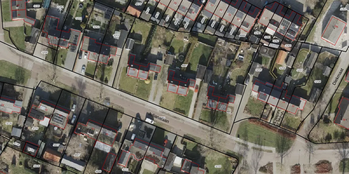 Het perceel waarop Julianalaan 26 staat heeft een oppervlakte van 3467 m². Dit is een zeer groot perceel. De perceeloppervlakte wordt geregistreerd door het Kadaster. Gedetailleerde informatie over de maten van dit perceel kunt u vinden in het rapport Kadastrale kaart met maatvoering van Julianalaan 26.