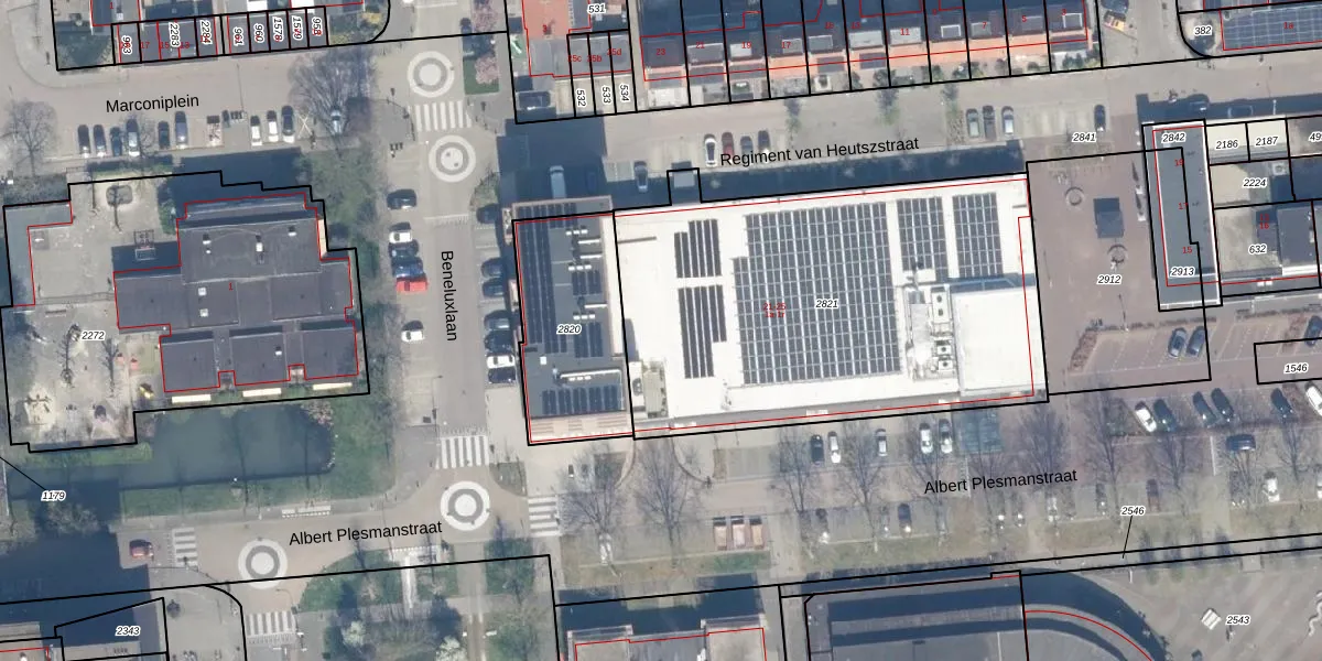 Het perceel waarop Beneluxlaan 1-b staat heeft een oppervlakte van 2215 m². Dit is een zeer groot perceel. De perceeloppervlakte wordt geregistreerd door het Kadaster. Gedetailleerde informatie over de maten van dit perceel kunt u vinden in het rapport Kadastrale kaart met maatvoering van Beneluxlaan 1-b.