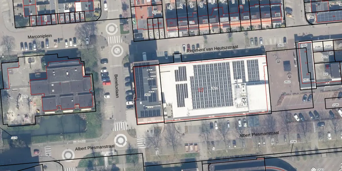 Het perceel waarop Beneluxlaan 1-c staat heeft een oppervlakte van 2215 m². Dit is een zeer groot perceel. De perceeloppervlakte wordt geregistreerd door het Kadaster. Gedetailleerde informatie over de maten van dit perceel kunt u vinden in het rapport Kadastrale kaart met maatvoering van Beneluxlaan 1-c.