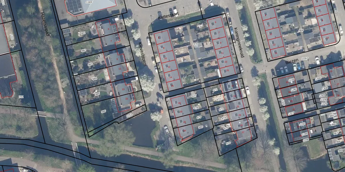 Kievitsbloem 16 is gelegen op kadastraal perceel SHV00E970. Deze kadastrale aanduiding is uniek en wordt gebruikt door het Kadaster om eigendomsrechten en andere zakelijke rechten vast te leggen. Het perceel maakt onderdeel uit van de kadastrale gemeente Schoonhoven.