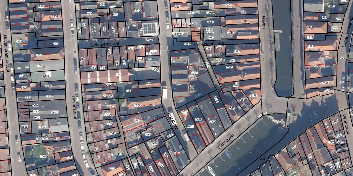 Het perceel waarop Koestraat 1-c staat heeft een oppervlakte van 590 m². Dit is een groot perceel. De perceeloppervlakte wordt geregistreerd door het Kadaster. Gedetailleerde informatie over de maten van dit perceel kunt u vinden in het rapport Kadastrale kaart met maatvoering van Koestraat 1-c.
