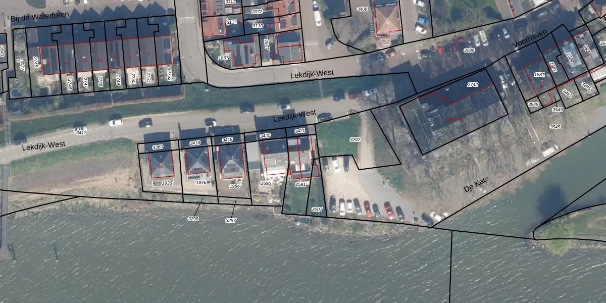 Lekdijk-West 8 is gelegen op kadastraal perceel SHV00C2591. Deze kadastrale aanduiding is uniek en wordt gebruikt door het Kadaster om eigendomsrechten en andere zakelijke rechten vast te leggen. Het perceel maakt onderdeel uit van de kadastrale gemeente Schoonhoven.
