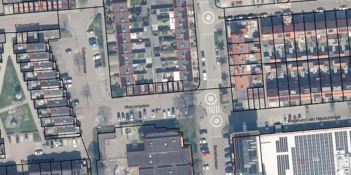 Het perceel waarop Marconiplein 5 staat heeft een oppervlakte van 17 m². Dit is een klein perceel. De perceeloppervlakte wordt geregistreerd door het Kadaster. Gedetailleerde informatie over de maten van dit perceel kunt u vinden in het rapport Kadastrale kaart met maatvoering van Marconiplein 5.