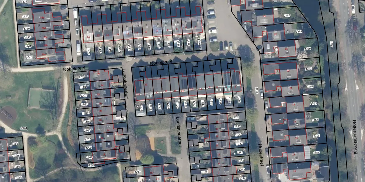 Nobeldreef 14 is gelegen op kadastraal perceel SHV00A1230. Deze kadastrale aanduiding is uniek en wordt gebruikt door het Kadaster om eigendomsrechten en andere zakelijke rechten vast te leggen. Het perceel maakt onderdeel uit van de kadastrale gemeente Schoonhoven.