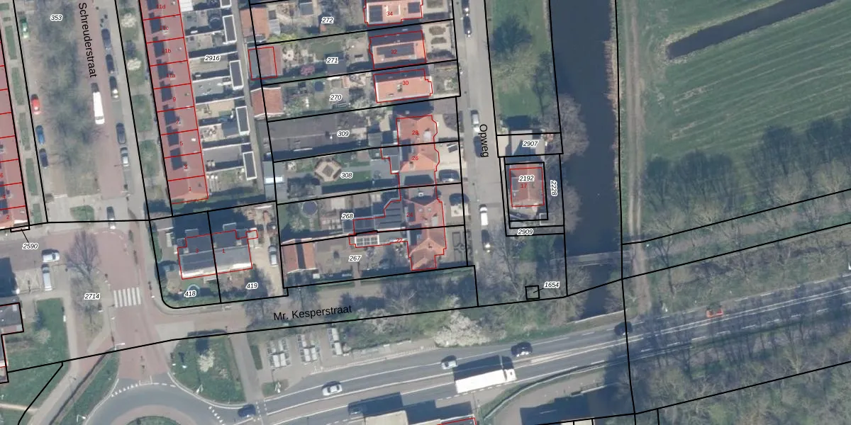 Het perceel waarop Opweg 24 staat heeft een oppervlakte van 434 m². Dit is een groot perceel. De perceeloppervlakte wordt geregistreerd door het Kadaster. Gedetailleerde informatie over de maten van dit perceel kunt u vinden in het rapport Kadastrale kaart met maatvoering van Opweg 24.
