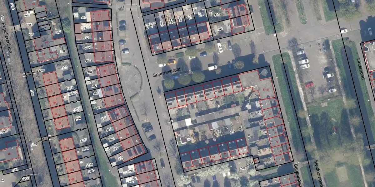 Sparrenstraat 5 is gelegen op kadastraal perceel SHV00E453. Deze kadastrale aanduiding is uniek en wordt gebruikt door het Kadaster om eigendomsrechten en andere zakelijke rechten vast te leggen. Het perceel maakt onderdeel uit van de kadastrale gemeente Schoonhoven.