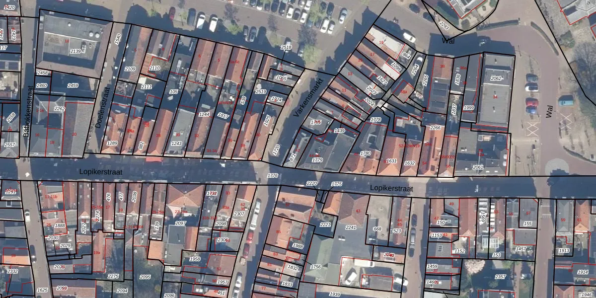 Het perceel waarop Varkensmarkt 1 staat heeft een oppervlakte van 65 m². Dit is een klein perceel. De perceeloppervlakte wordt geregistreerd door het Kadaster. Gedetailleerde informatie over de maten van dit perceel kunt u vinden in het rapport Kadastrale kaart met maatvoering van Varkensmarkt 1.