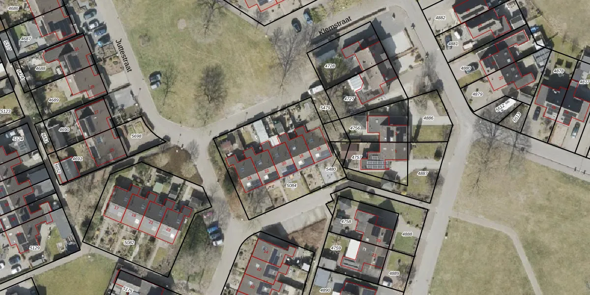 Het perceel waarop Juttestraat 18 staat heeft een oppervlakte van 1075 m². Dit is een zeer groot perceel. De perceeloppervlakte wordt geregistreerd door het Kadaster. Gedetailleerde informatie over de maten van dit perceel kunt u vinden in het rapport Kadastrale kaart met maatvoering van Juttestraat 18.