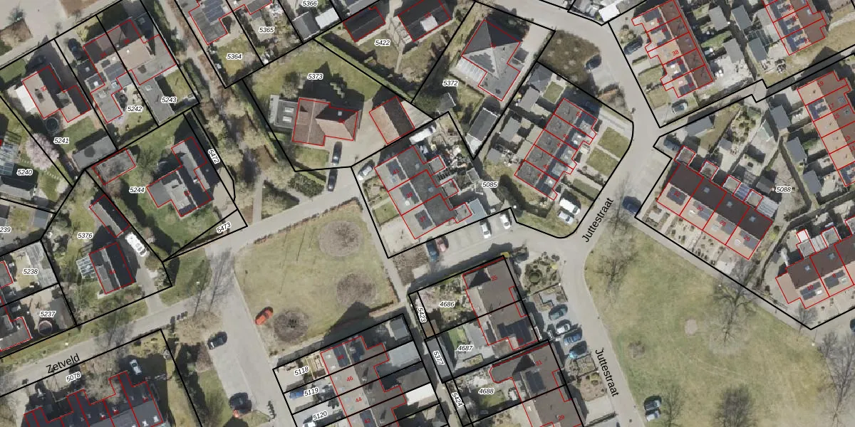 Het perceel waarop Juttestraat 37 staat heeft een oppervlakte van 1600 m². Dit is een zeer groot perceel. De perceeloppervlakte wordt geregistreerd door het Kadaster. Gedetailleerde informatie over de maten van dit perceel kunt u vinden in het rapport Kadastrale kaart met maatvoering van Juttestraat 37.