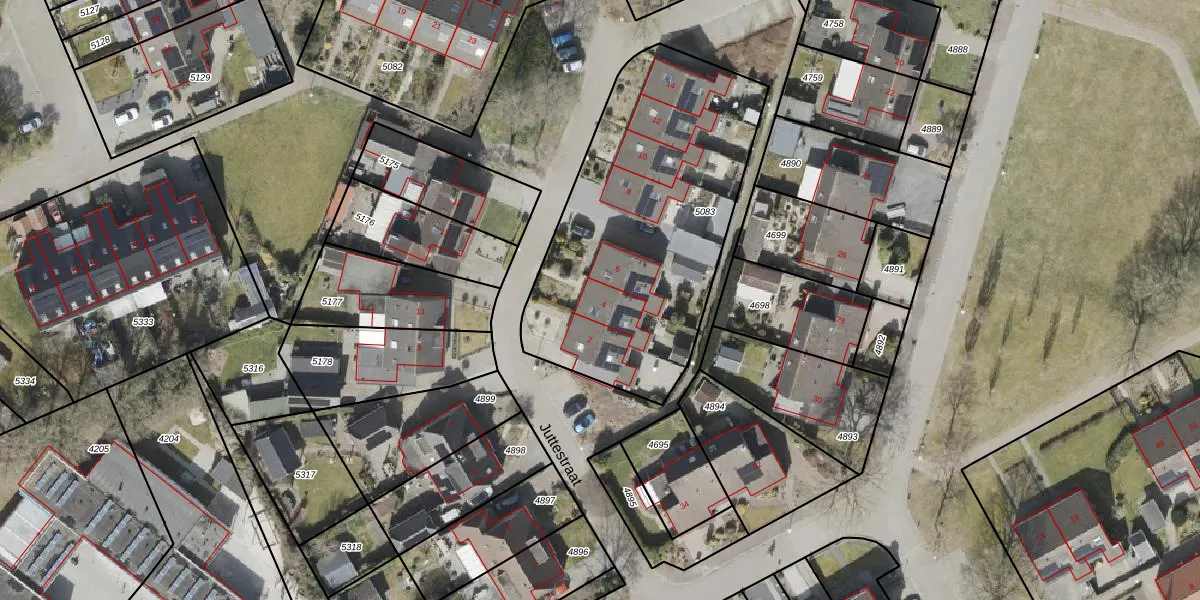 Het perceel waarop Juttestraat 4 staat heeft een oppervlakte van 1480 m². Dit is een zeer groot perceel. De perceeloppervlakte wordt geregistreerd door het Kadaster. Gedetailleerde informatie over de maten van dit perceel kunt u vinden in het rapport Kadastrale kaart met maatvoering van Juttestraat 4.