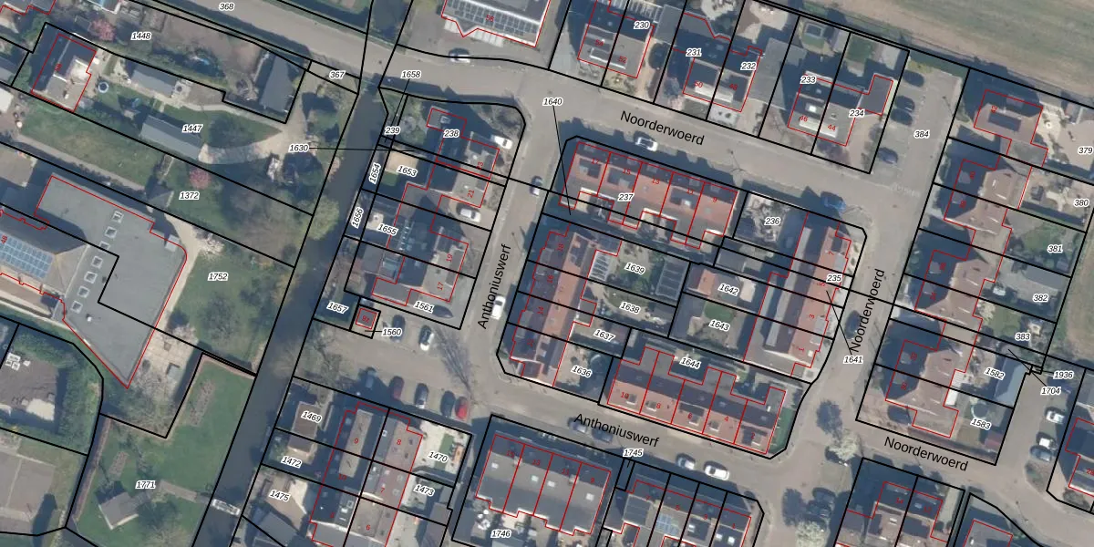 Anthoniuswerf 16 is gelegen op kadastraal perceel SRW02B1638. Deze kadastrale aanduiding is uniek en wordt gebruikt door het Kadaster om eigendomsrechten en andere zakelijke rechten vast te leggen. Het perceel maakt onderdeel uit van de kadastrale gemeente Schoonrewoerd.