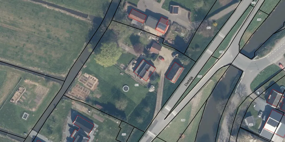 Het perceel waarop Diefdijk 12 staat heeft een oppervlakte van 4015 m². Dit is een zeer groot perceel. De perceeloppervlakte wordt geregistreerd door het Kadaster. Gedetailleerde informatie over de maten van dit perceel kunt u vinden in het rapport Kadastrale kaart met maatvoering van Diefdijk 12.
