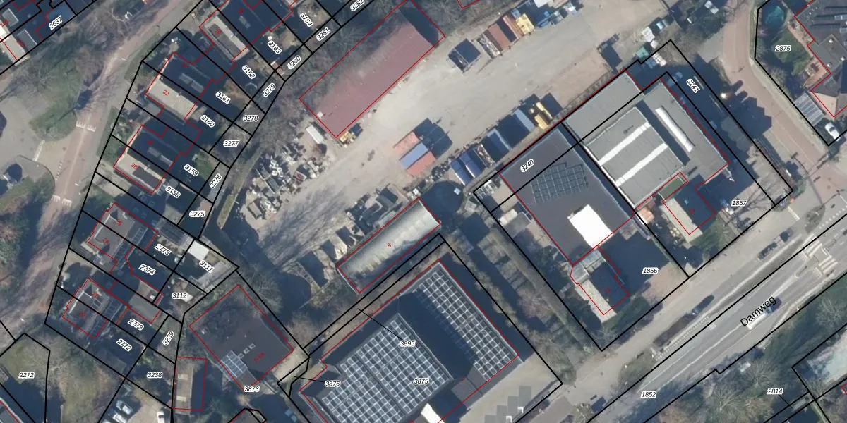 Het perceel waarop Damweg 9 staat heeft een oppervlakte van 3,3 ha. Dit is een zeer groot perceel. De perceeloppervlakte wordt geregistreerd door het Kadaster. Gedetailleerde informatie over de maten van dit perceel kunt u vinden in het rapport Kadastrale kaart met maatvoering van Damweg 9.