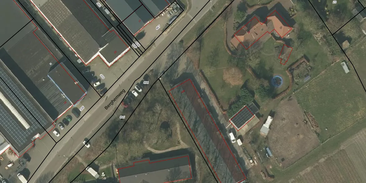 Het perceel waarop Berghemweg 10-b staat heeft een oppervlakte van 2,5 ha. Dit is een zeer groot perceel. De perceeloppervlakte wordt geregistreerd door het Kadaster. Gedetailleerde informatie over de maten van dit perceel kunt u vinden in het rapport Kadastrale kaart met maatvoering van Berghemweg 10-b.