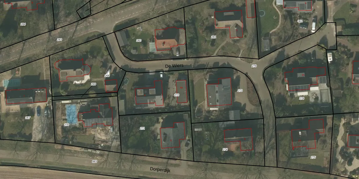 Het perceel waarop De Wiers 4-a staat heeft een oppervlakte van 910 m². Dit is een groot perceel. De perceeloppervlakte wordt geregistreerd door het Kadaster. Gedetailleerde informatie over de maten van dit perceel kunt u vinden in het rapport Kadastrale kaart met maatvoering van De Wiers 4-a.