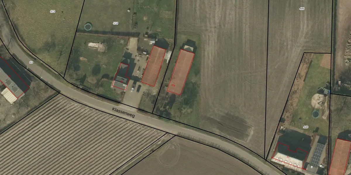 Het perceel waarop Klassenweg 55-a staat heeft een oppervlakte van 1,2 ha. Dit is een zeer groot perceel. De perceeloppervlakte wordt geregistreerd door het Kadaster. Gedetailleerde informatie over de maten van dit perceel kunt u vinden in het rapport Kadastrale kaart met maatvoering van Klassenweg 55-a.