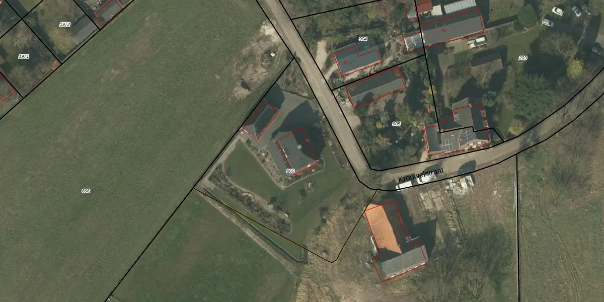 Het perceel waarop Krouwelstraat 4 staat heeft een oppervlakte van 1989 m². Dit is een zeer groot perceel. De perceeloppervlakte wordt geregistreerd door het Kadaster. Gedetailleerde informatie over de maten van dit perceel kunt u vinden in het rapport Kadastrale kaart met maatvoering van Krouwelstraat 4.