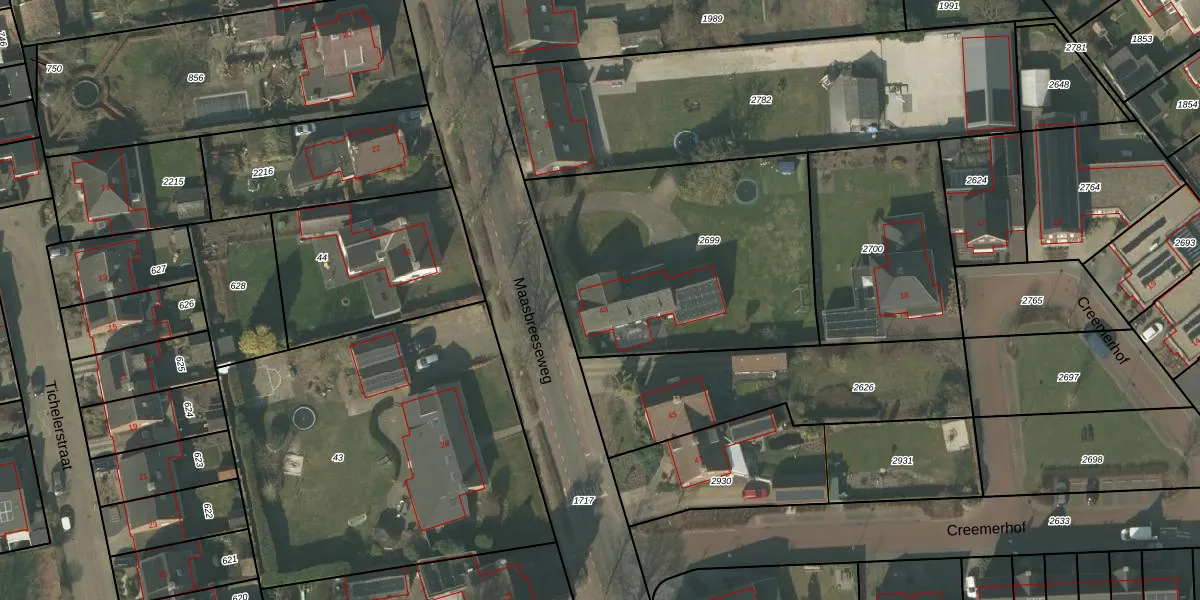 Het perceel waarop Maasbreeseweg 43 staat heeft een oppervlakte van 1375 m². Dit is een zeer groot perceel. De perceeloppervlakte wordt geregistreerd door het Kadaster. Gedetailleerde informatie over de maten van dit perceel kunt u vinden in het rapport Kadastrale kaart met maatvoering van Maasbreeseweg 43.