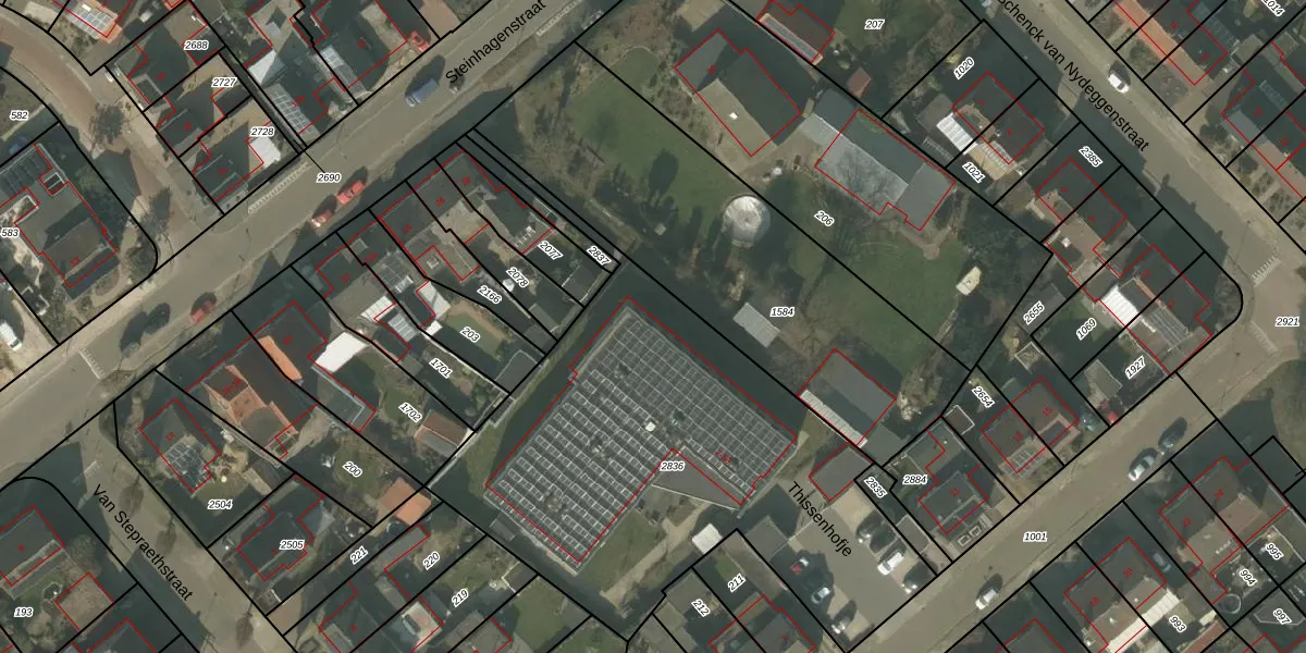 Het perceel waarop Thissenhofje 42 staat heeft een oppervlakte van 2385 m². Dit is een zeer groot perceel. De perceeloppervlakte wordt geregistreerd door het Kadaster. Gedetailleerde informatie over de maten van dit perceel kunt u vinden in het rapport Kadastrale kaart met maatvoering van Thissenhofje 42.