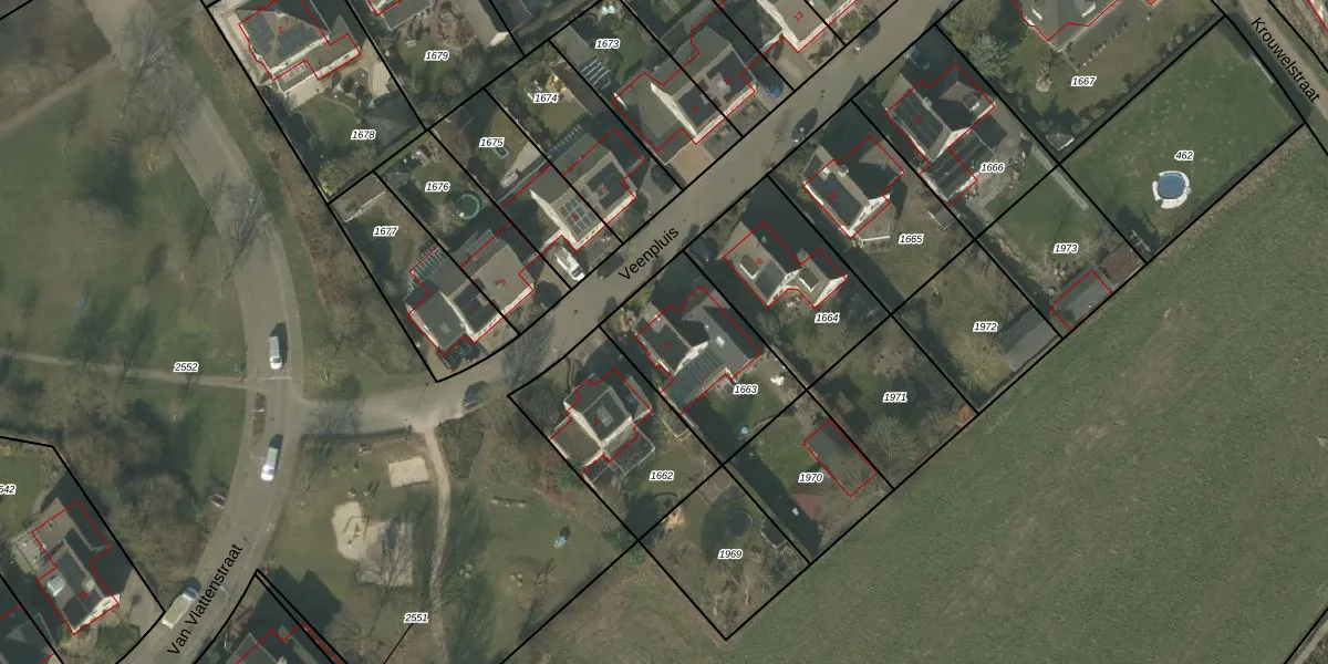 Het perceel waarop Veenpluis 6 staat heeft een oppervlakte van 478 m². Dit is een groot perceel. De perceeloppervlakte wordt geregistreerd door het Kadaster. Gedetailleerde informatie over de maten van dit perceel kunt u vinden in het rapport Kadastrale kaart met maatvoering van Veenpluis 6.