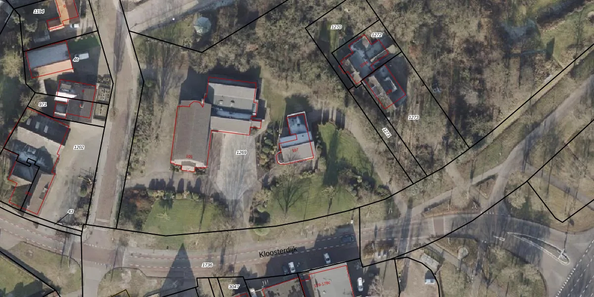 Het perceel waarop Kloosterdijk 107 staat heeft een oppervlakte van 5369 m². Dit is een zeer groot perceel. De perceeloppervlakte wordt geregistreerd door het Kadaster. Gedetailleerde informatie over de maten van dit perceel kunt u vinden in het rapport Kadastrale kaart met maatvoering van Kloosterdijk 107.