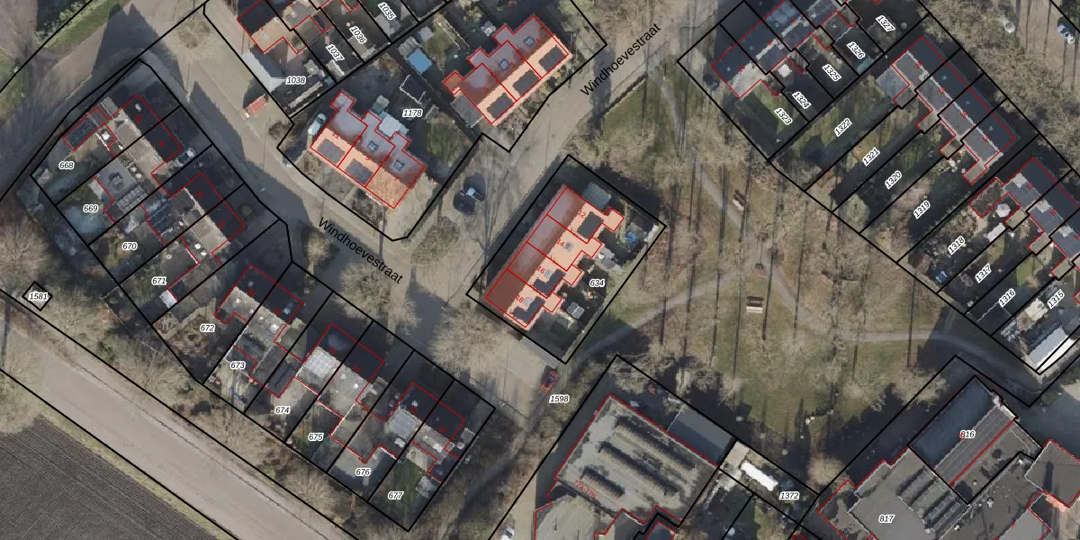 Het perceel waarop Windhoevestraat 16 staat heeft een oppervlakte van 714 m². Dit is een groot perceel. De perceeloppervlakte wordt geregistreerd door het Kadaster. Gedetailleerde informatie over de maten van dit perceel kunt u vinden in het rapport Kadastrale kaart met maatvoering van Windhoevestraat 16.