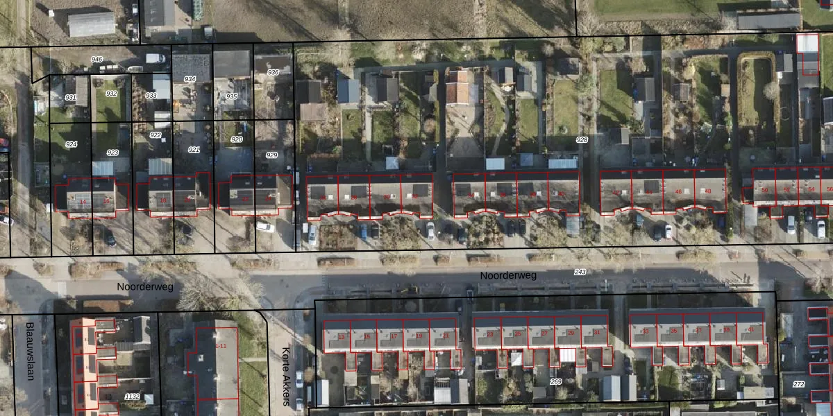 Het perceel waarop Noorderweg 32 staat heeft een oppervlakte van 6933 m². Dit is een zeer groot perceel. De perceeloppervlakte wordt geregistreerd door het Kadaster. Gedetailleerde informatie over de maten van dit perceel kunt u vinden in het rapport Kadastrale kaart met maatvoering van Noorderweg 32.