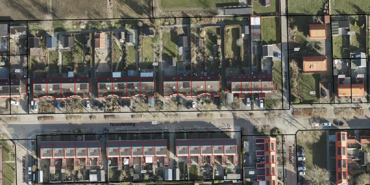 Het perceel waarop Noorderweg 44 staat heeft een oppervlakte van 6933 m². Dit is een zeer groot perceel. De perceeloppervlakte wordt geregistreerd door het Kadaster. Gedetailleerde informatie over de maten van dit perceel kunt u vinden in het rapport Kadastrale kaart met maatvoering van Noorderweg 44.