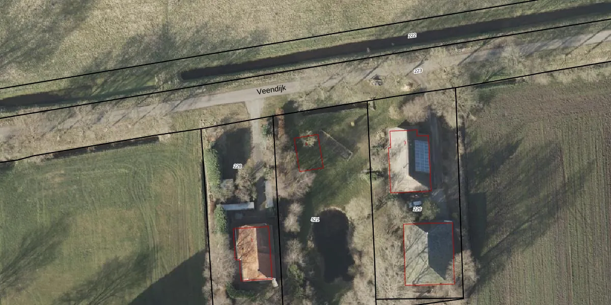 Het perceel waarop Veendijk 3 staat heeft een oppervlakte van 2104 m². Dit is een zeer groot perceel. De perceeloppervlakte wordt geregistreerd door het Kadaster. Gedetailleerde informatie over de maten van dit perceel kunt u vinden in het rapport Kadastrale kaart met maatvoering van Veendijk 3.