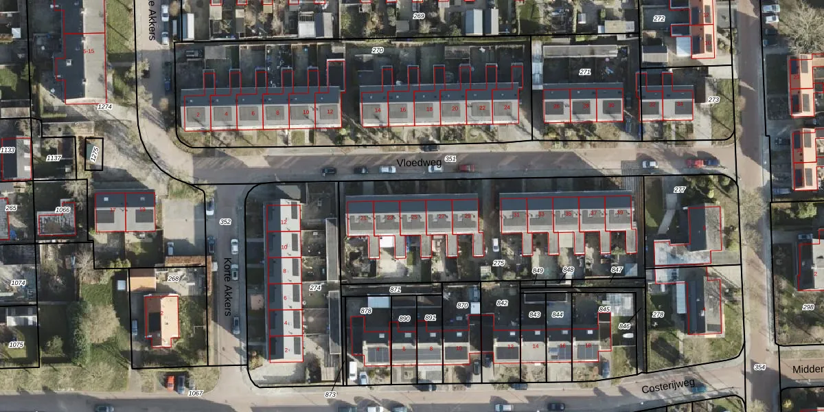 Het perceel waarop Vloedweg 25 staat heeft een oppervlakte van 1850 m². Dit is een zeer groot perceel. De perceeloppervlakte wordt geregistreerd door het Kadaster. Gedetailleerde informatie over de maten van dit perceel kunt u vinden in het rapport Kadastrale kaart met maatvoering van Vloedweg 25.