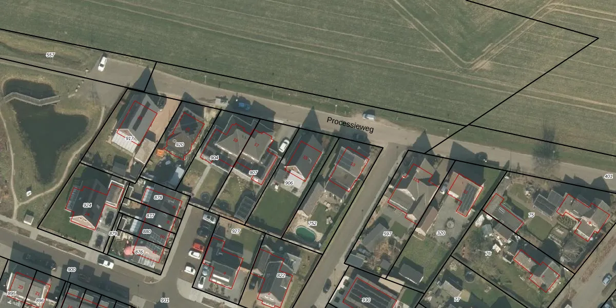 Het perceel waarop Processieweg 15 staat heeft een oppervlakte van 471 m². Dit is een groot perceel. De perceeloppervlakte wordt geregistreerd door het Kadaster. Gedetailleerde informatie over de maten van dit perceel kunt u vinden in het rapport Kadastrale kaart met maatvoering van Processieweg 15.