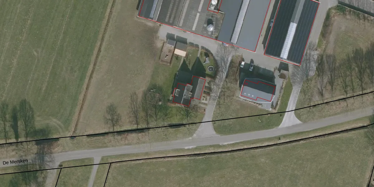 Het perceel waarop De Mersken 1 staat heeft een oppervlakte van 19,8 ha. Dit is een zeer groot perceel. De perceeloppervlakte wordt geregistreerd door het Kadaster. Gedetailleerde informatie over de maten van dit perceel kunt u vinden in het rapport Kadastrale kaart met maatvoering van De Mersken 1.