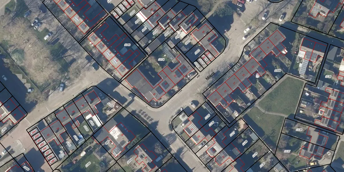 Het perceel waarop Mient 54 staat heeft een oppervlakte van 912 m². Dit is een groot perceel. De perceeloppervlakte wordt geregistreerd door het Kadaster. Gedetailleerde informatie over de maten van dit perceel kunt u vinden in het rapport Kadastrale kaart met maatvoering van Mient 54.