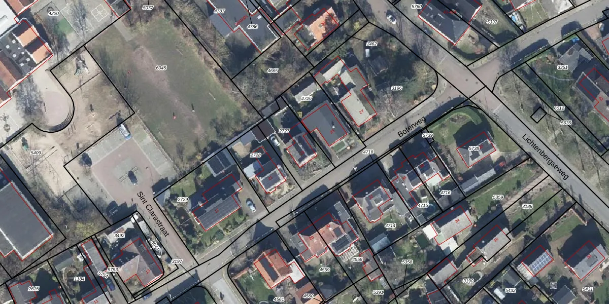 Het perceel waarop Boterweg 23 staat heeft een oppervlakte van 340 m². Dit is een groot perceel. De perceeloppervlakte wordt geregistreerd door het Kadaster. Gedetailleerde informatie over de maten van dit perceel kunt u vinden in het rapport Kadastrale kaart met maatvoering van Boterweg 23.