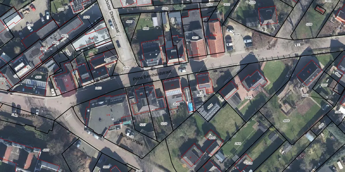 Het perceel waarop Prins Bernhardstraat 14 staat heeft een oppervlakte van 425 m². Dit is een groot perceel. De perceeloppervlakte wordt geregistreerd door het Kadaster. Gedetailleerde informatie over de maten van dit perceel kunt u vinden in het rapport Kadastrale kaart met maatvoering van Prins Bernhardstraat 14.