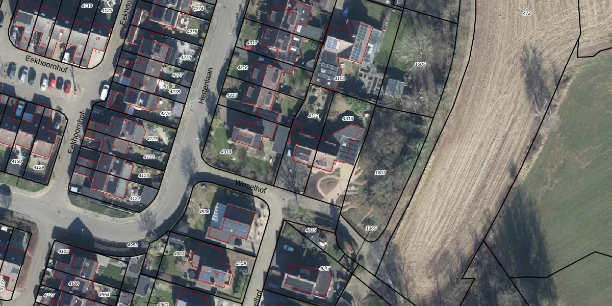 Het perceel waarop Wezelhof 1 staat heeft een oppervlakte van 345 m². Dit is een groot perceel. De perceeloppervlakte wordt geregistreerd door het Kadaster. Gedetailleerde informatie over de maten van dit perceel kunt u vinden in het rapport Kadastrale kaart met maatvoering van Wezelhof 1.