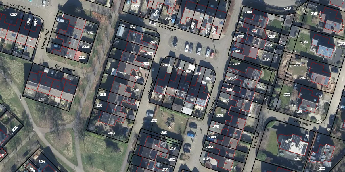 Het perceel waarop Wezelhof 44 staat heeft een oppervlakte van 174 m². Dit is een middelgroot perceel. De perceeloppervlakte wordt geregistreerd door het Kadaster. Gedetailleerde informatie over de maten van dit perceel kunt u vinden in het rapport Kadastrale kaart met maatvoering van Wezelhof 44.