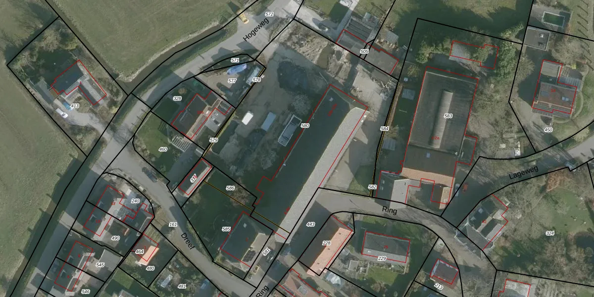 Het perceel waarop Hogeweg 12-b staat heeft een oppervlakte van 2569 m². Dit is een zeer groot perceel. De perceeloppervlakte wordt geregistreerd door het Kadaster. Gedetailleerde informatie over de maten van dit perceel kunt u vinden in het rapport Kadastrale kaart met maatvoering van Hogeweg 12-b.
