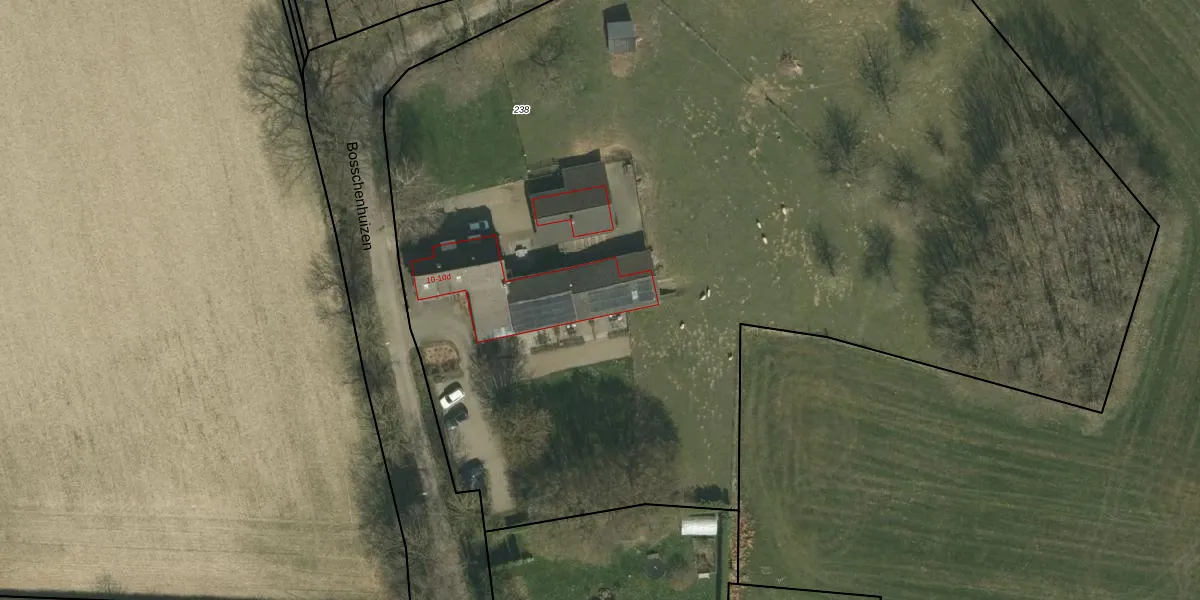 Het perceel waarop Bosschenhuizen 10-d staat heeft een oppervlakte van 9540 m². Dit is een zeer groot perceel. De perceeloppervlakte wordt geregistreerd door het Kadaster. Gedetailleerde informatie over de maten van dit perceel kunt u vinden in het rapport Kadastrale kaart met maatvoering van Bosschenhuizen 10-d.