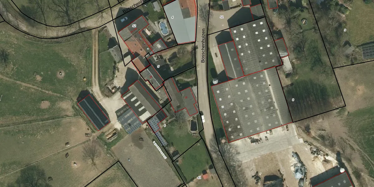 Het perceel waarop Bosschenhuizen 19 staat heeft een oppervlakte van 835 m². Dit is een groot perceel. De perceeloppervlakte wordt geregistreerd door het Kadaster. Gedetailleerde informatie over de maten van dit perceel kunt u vinden in het rapport Kadastrale kaart met maatvoering van Bosschenhuizen 19.