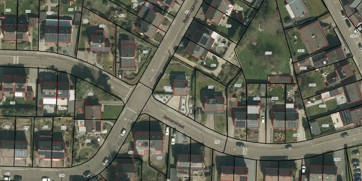 Het perceel waarop Jamarstraat 1 staat heeft een oppervlakte van 535 m². Dit is een groot perceel. De perceeloppervlakte wordt geregistreerd door het Kadaster. Gedetailleerde informatie over de maten van dit perceel kunt u vinden in het rapport Kadastrale kaart met maatvoering van Jamarstraat 1.